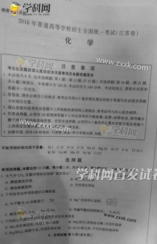 2016年江蘇高考化學真題及答案
