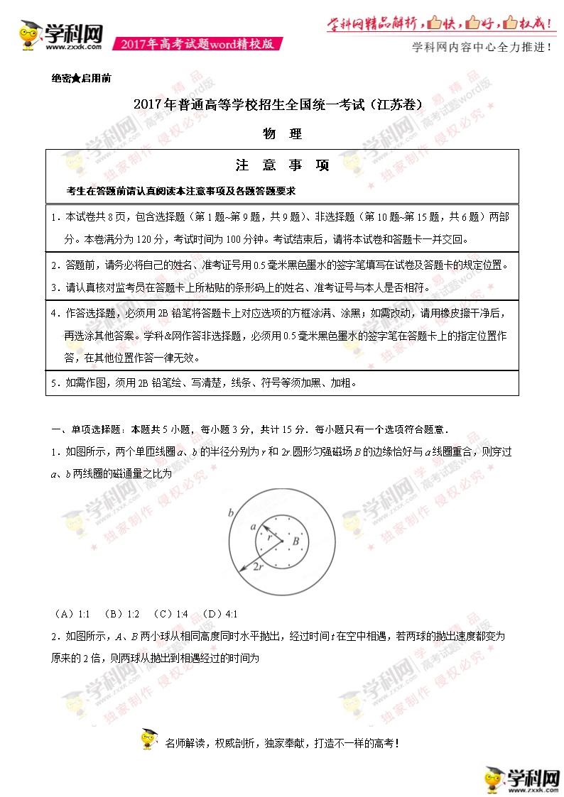 2017年江蘇高考物理真題及答案由育路高考網(wǎng)考后首發(fā),更多關(guān)于江蘇高考答案、江蘇高考試題等信息,請關(guān)注育路高考網(wǎng)或微信搜索“育路高考招生網(wǎng)”獲取。