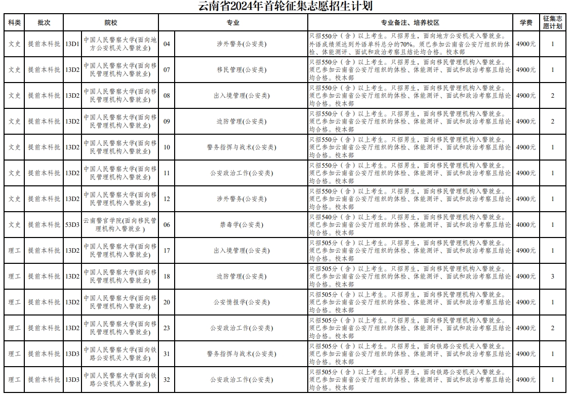 2024年本科提前批在云南省進行征集的院校有中國人民警察大學、云南警官學院、陸軍軍醫大學等;國家專項計劃在云南第一次征集的院校有中國人民大學、陜西師范大學、云南民族大學、北京理工大學、北京郵電大學、華東理工大學、浙江大學、廈門大學、福州大學等。