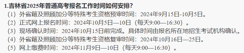 根據吉林省教育考生院最新發布的高考報名工作相關事項問答,2025年吉林高考的正式網上報名時間為2024年10月5日至10日(每天9:00-16:30),對于外省籍及照顧加分等特殊考生,資格預審時間為2024年9月15日至10月5日,具體安排如下: